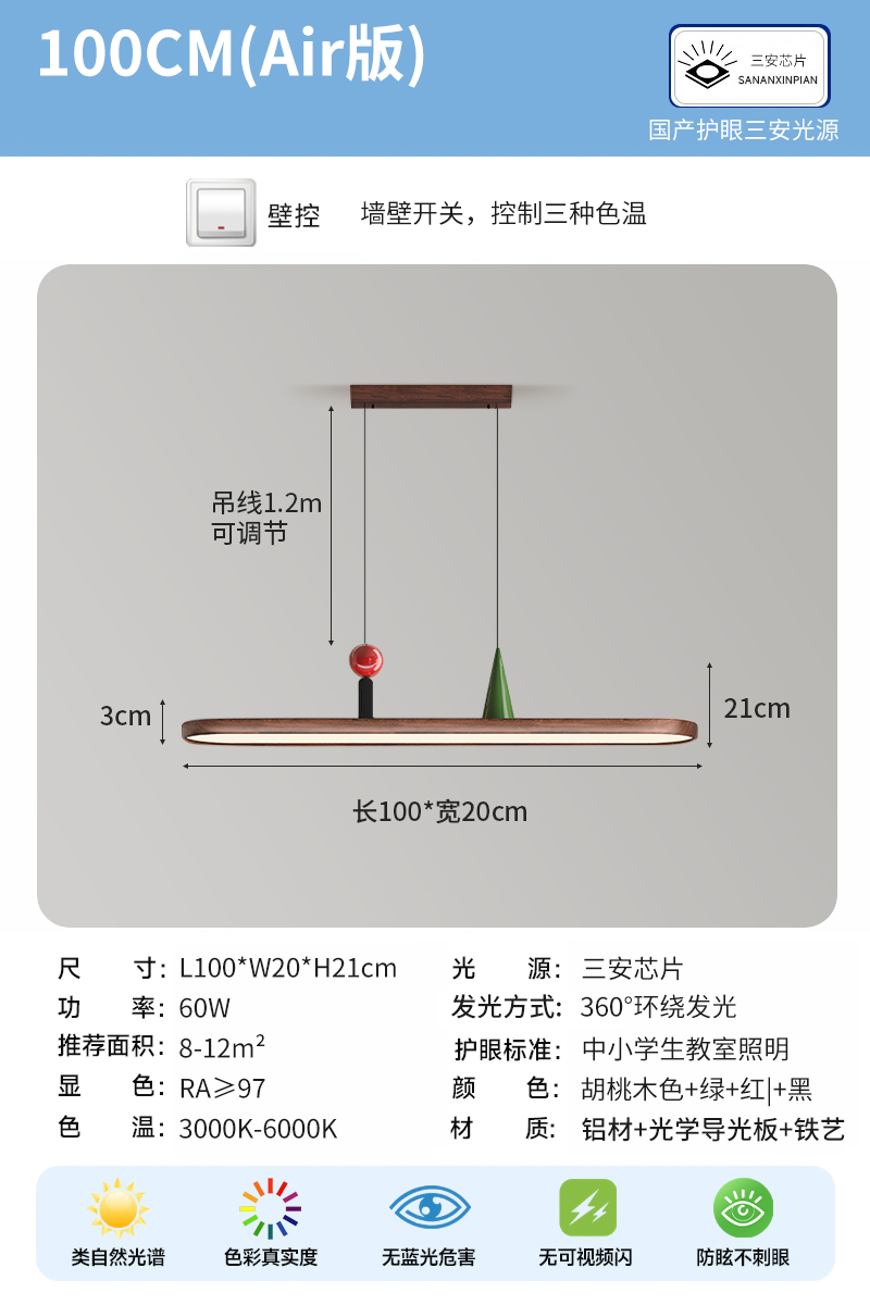 光源:LED三色变光+全光谱护眼